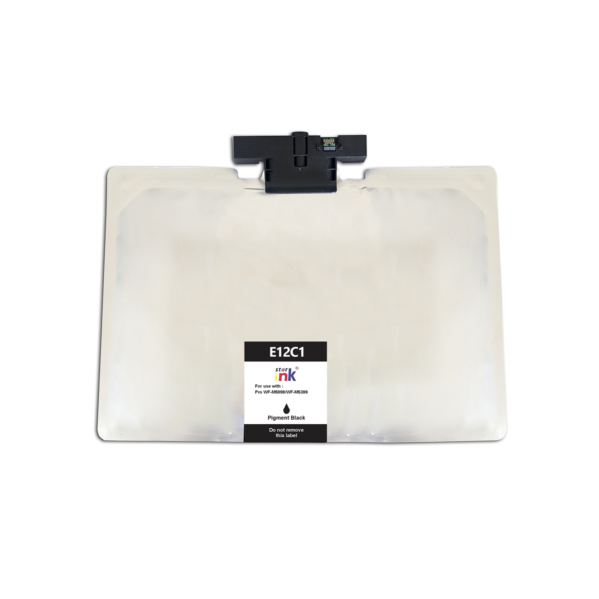 Cartucho bolsa de tinta pigmentada compatível Epson DS-E12C1, E12 Preto BK 795ml com capacidade de rendimento para 40 mil páginas considerando 5% de cobertura no papel A4. Para uso nos seguintes equipamentos: Workforce Pro WF-M5899 e WF-M5399.