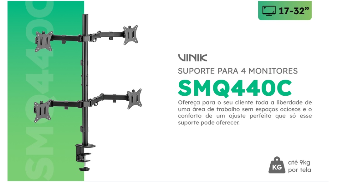 O suporte para quatro monitores Vinik combina design inteligente com praticidade, tornando-o uma escolha elegante para profissionais modernos. Proporcione uma nova era de conforto e produtividade com nosso suporte para monitor. Esteja o seu cliente em casa, no escritório ou em movimento, a solução ideal para as necessidades. Feito para monitores, TVs, telas Ultrawide, LCD e LED de 17" a 32" com peso de até 9kg e compatíveis com padrão de fixação VESA 75x75 ou VESA 100x100 (HxV).